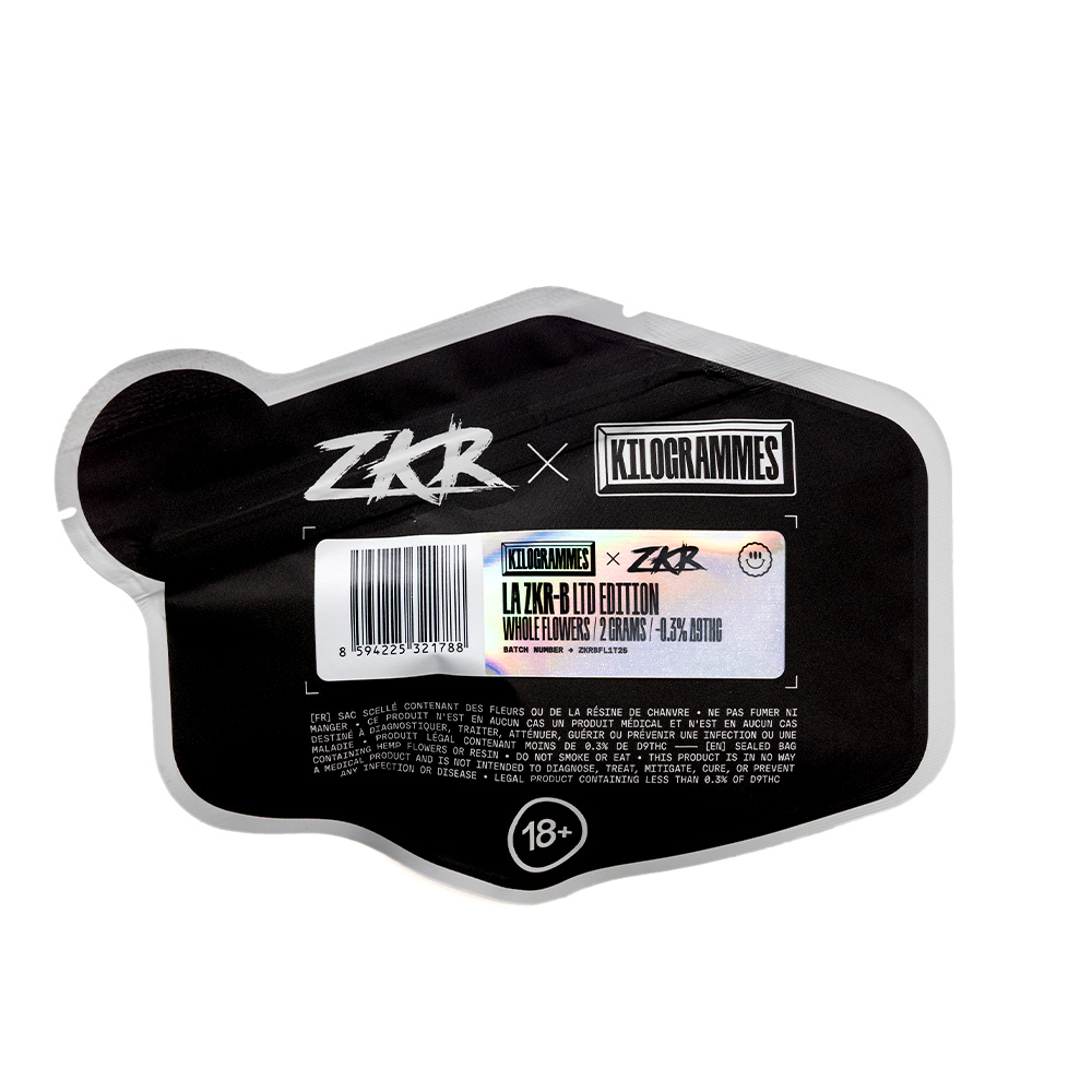 ZKR-B: the well-crafted collaboration between Kilogrammes and ZKR in a limited edition. Small, dark, dense, and very resinous buds. On the nose, lively citrus and sweet cherry on a creamy base. On the palate, a fruity and tangy gas, enhanced by candied cherry. The effects? Slow but sure: the mind relaxes, the body follows. An indoor flower without glitter: serious, square, like the artist. ZKR x Kilogrammes, it’s the street that meets know-how. For all BtoB inquiries, please send an email to benoit@kilogrammes.com. All orders placed before 12:00 are shipped the same day. Home delivery within 3 business days.